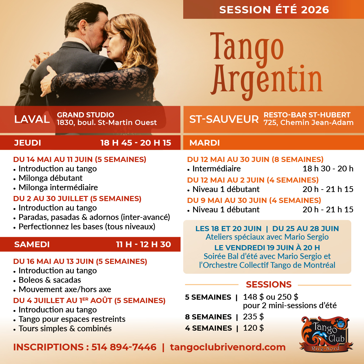 Tango Club Rive-Nord offre des cours de Tango Argentin, ainsi qu’une multitude d’activités et d’événements tout au long de l’année. Vous souhaitez découvrir le Tango Argentin ou en approfondir la connaissance ? Vous voulez pratiquer le tango dans une ambiance chaleureuse ? Que vous soyez danseur ou étudiant et quel que soit votre niveau de danse, participez à nos activités.
