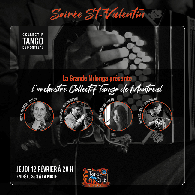 L’Ensemble Collectif Tango de Montréal sera dès nôtres. Des musiciens talentueux et de grande renommée vous préparent une soirée époustouflante aux musiques traditionnelles de Tango Argentin, mettant en vedette le bandonéoniste invité Alex Roitman.